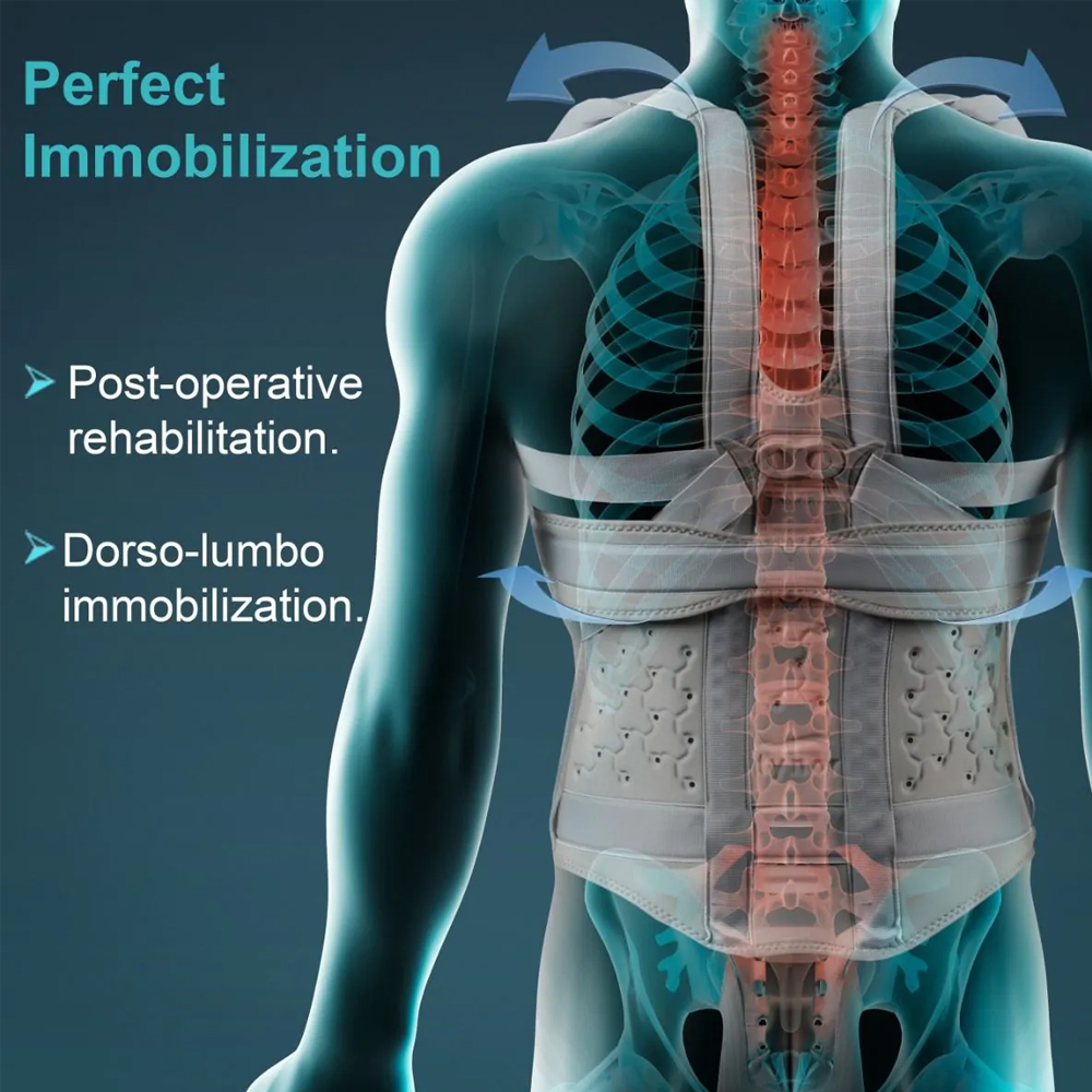 Spinal brace to providing full support and comprehensive coverage to thoracic-lumbar-sacral spinal sections. The brace immobilizes the spine in neutral position, still permitting the requisite body movement for normal activity while keeping the weak spine structure protected and in correct posture. *Use this product under the guidance of a qualified doctor.