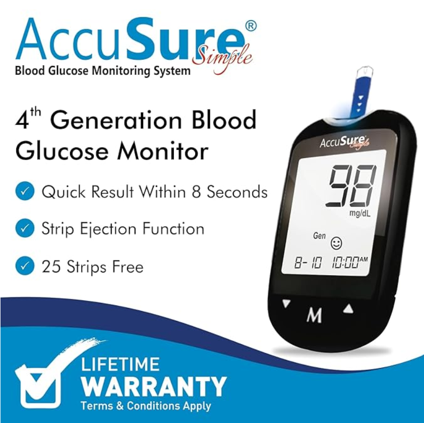 AccuSure Simple Digital Glucometer Kit for regular RBS test and home blood sugar monitoring. Delivers results in about 8 seconds using a small blood sample. Includes 25 test strips, 10 lancets, a lancing device, and carrying pouch. Features a clear display, memory for past readings, and simple operation for daily use.