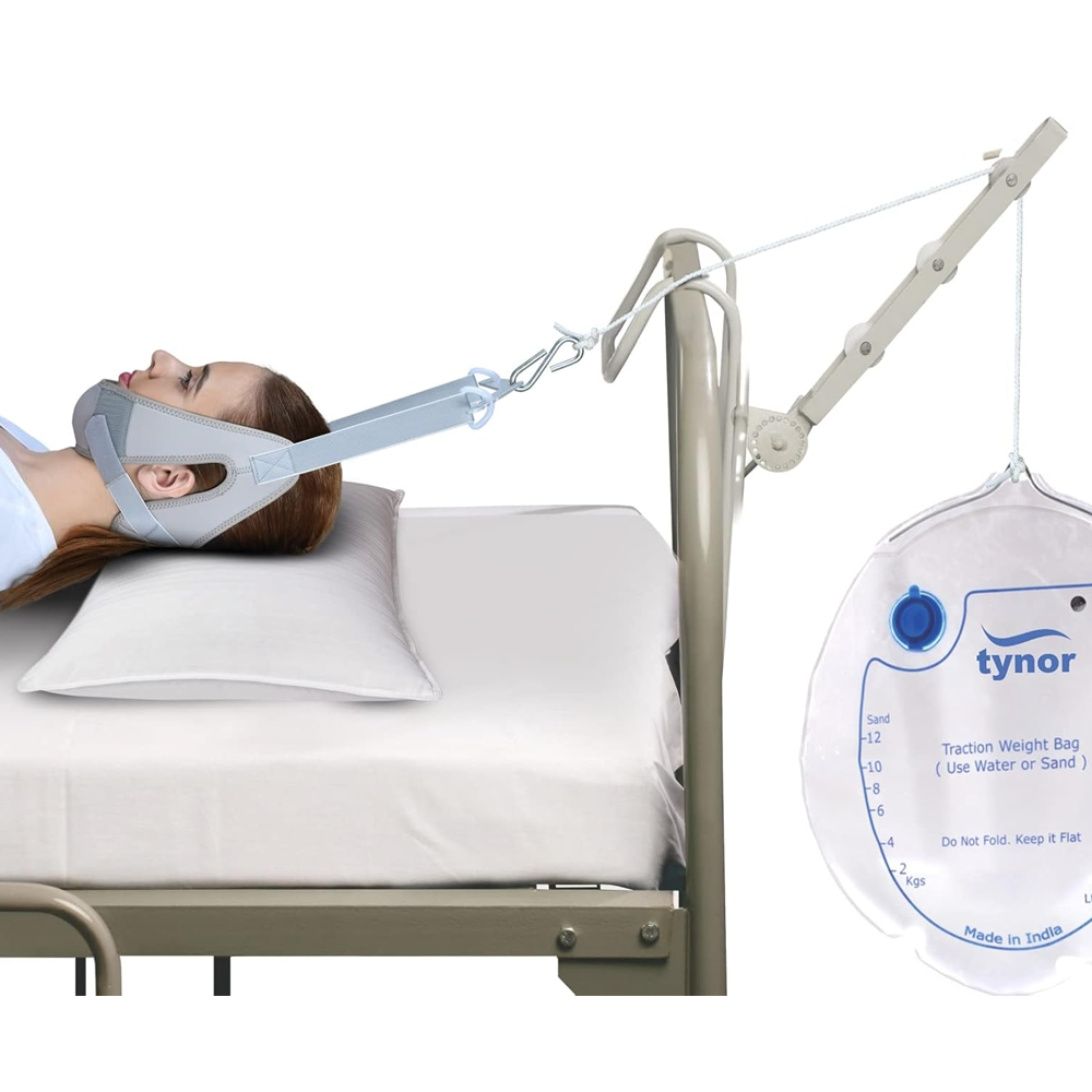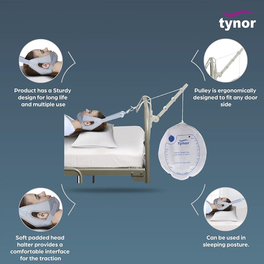 Tynor Cervical Traction Kit is a complete apparatus designed to provide traction to the cervical and upper dorsal vertebras. It relieves pressure by stretching the musculature and connective tissue components of the cervical spine. It expands the intervertebral joint space and relieves pressure on the anterior vertebral bodies. It provides the convenience of traction therapy at home. Cervical traction Kit includes the following • Traction Pulley Bracket • Cervical Traction Head Halter • Cervical Traction Spreader Bar • Traction Cord 5 ft. • Traction Weight Bag
