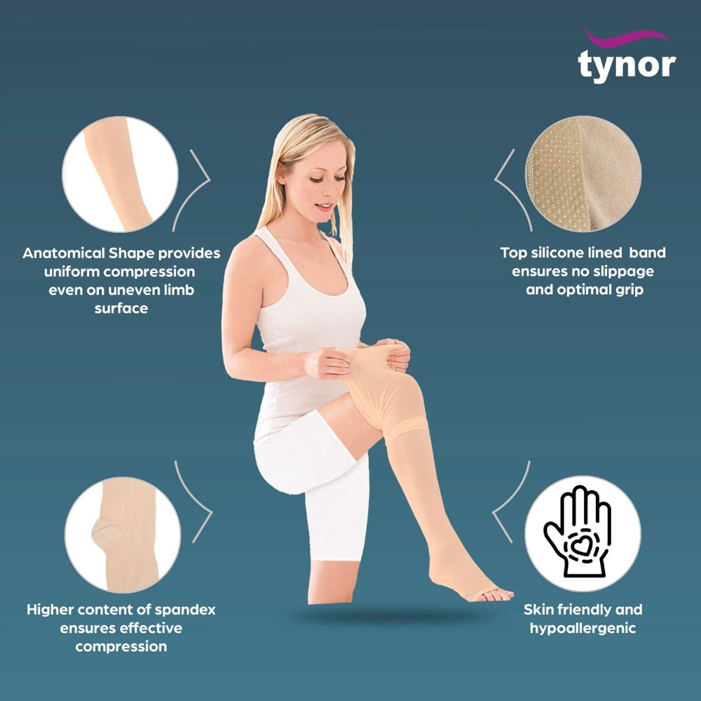 Provides compression, which is strongest at the ankle and gradually decreases as we move up. This controlled and graduated compression effectively stops any abnormal backflow of blood. They compress the outer walls of superficial veins to make them strong and prevent varicose veins.