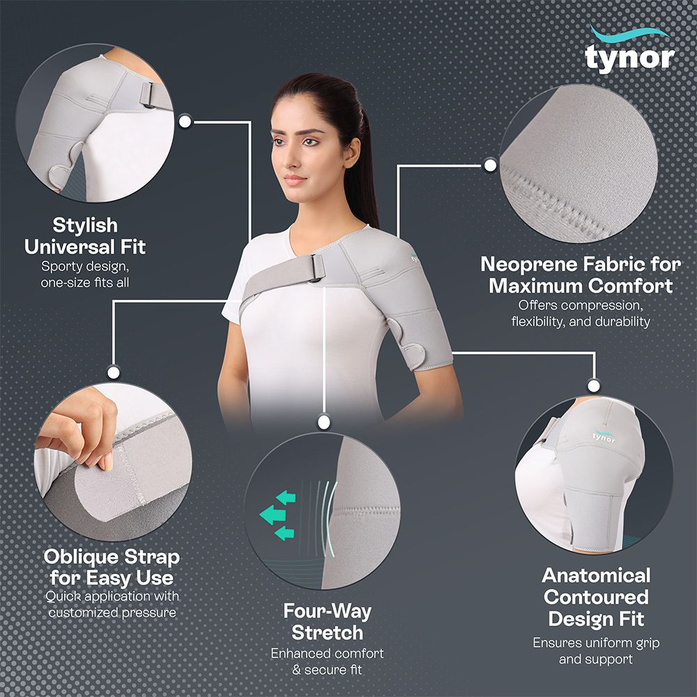 Scientifically designed to provide protection, support, compression and warmth to the shoulder joint. Helps to correct alignment of the shoulder joint following dislocation or subluxation. It restricts the shoulder movement, protects the shoulder from injuries due to sudden jerks, provides warmth, improves healing and manages pain.