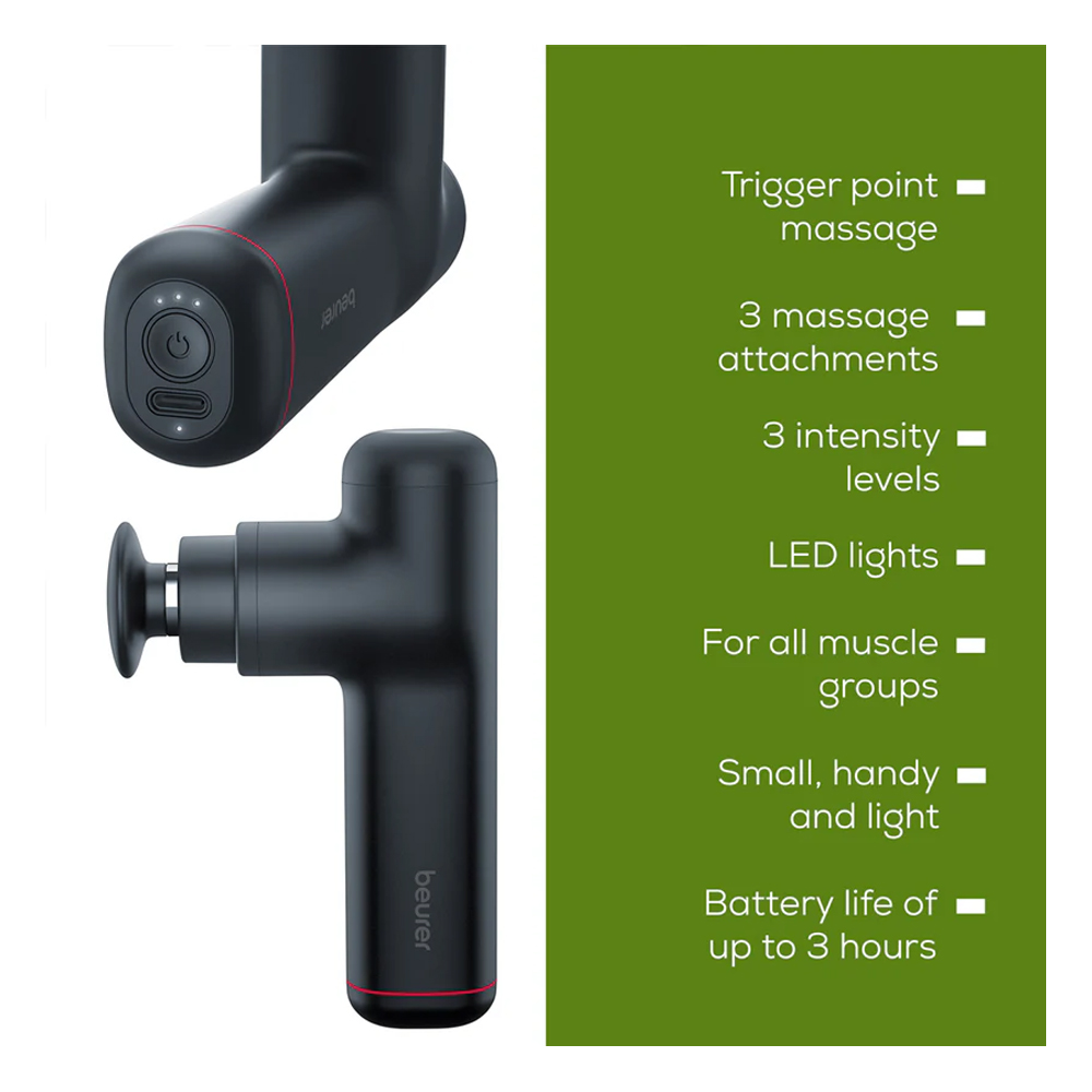Beurer Muscle Body Gun Massager for sensitive area like Neck, Foot and Jaw muscles/With Vibration/ 3 massage attachment